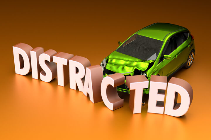 Green compact car crashed into displaced DISTRACTED letters concept for distracted driving