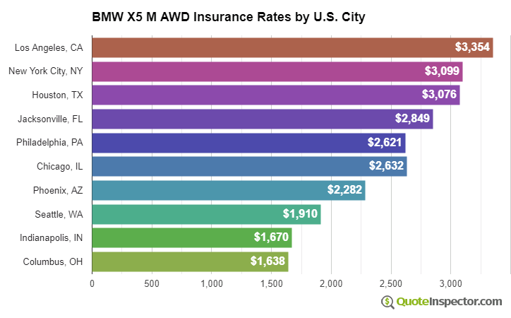 Your home state makes a big difference in BMW X5 M AWD insurance prices. A 40-year-old driver could pay as low as $1,180 a year in states like , , and North Carolina, or be forced to pay as much as $1,800 on average in California, Montana, and Michigan. Rates by state and city are shown later in the article.