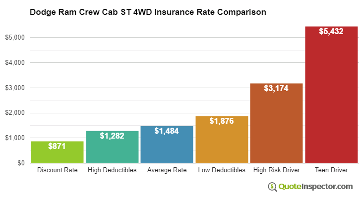 Using a middle-aged driver as an example, Dodge Ram Crew Cab ST 4WD insurance rates go from the low end price of $486 for just liability coverage to a high rate of $3,174 for a high-risk driver policy.