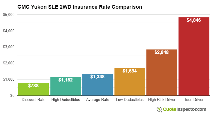 The average insurance rates for a GMC Yukon SLE 2WD are $1,338 a year for full coverage insurance. Comprehensive costs on average $340, collision insurance costs $476, and liability insurance costs around $364. Buying just liability costs as low as $430 a year, and insurance for high-risk drivers costs around $2,848. Teen drivers cost the most to insure at up to $4,846 a year.
