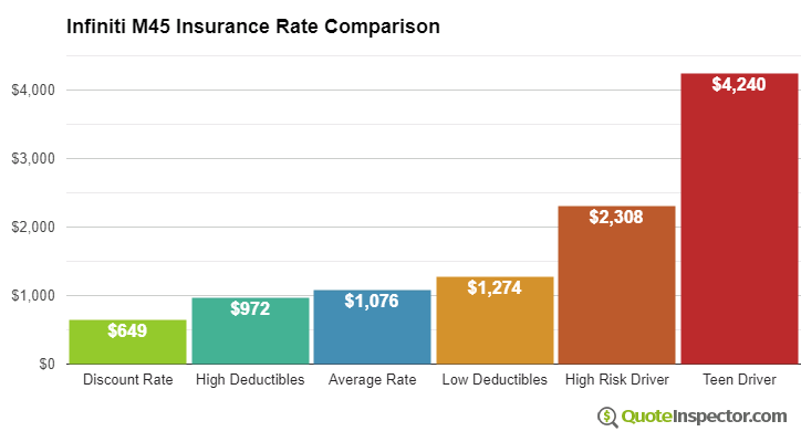 For the average 40-year-old driver, Infiniti M45 insurance rates range from the cheapest price of $438 for your basic liability-only policy to a high rate of $3,744 for a driver who has had serious violations or accidents.